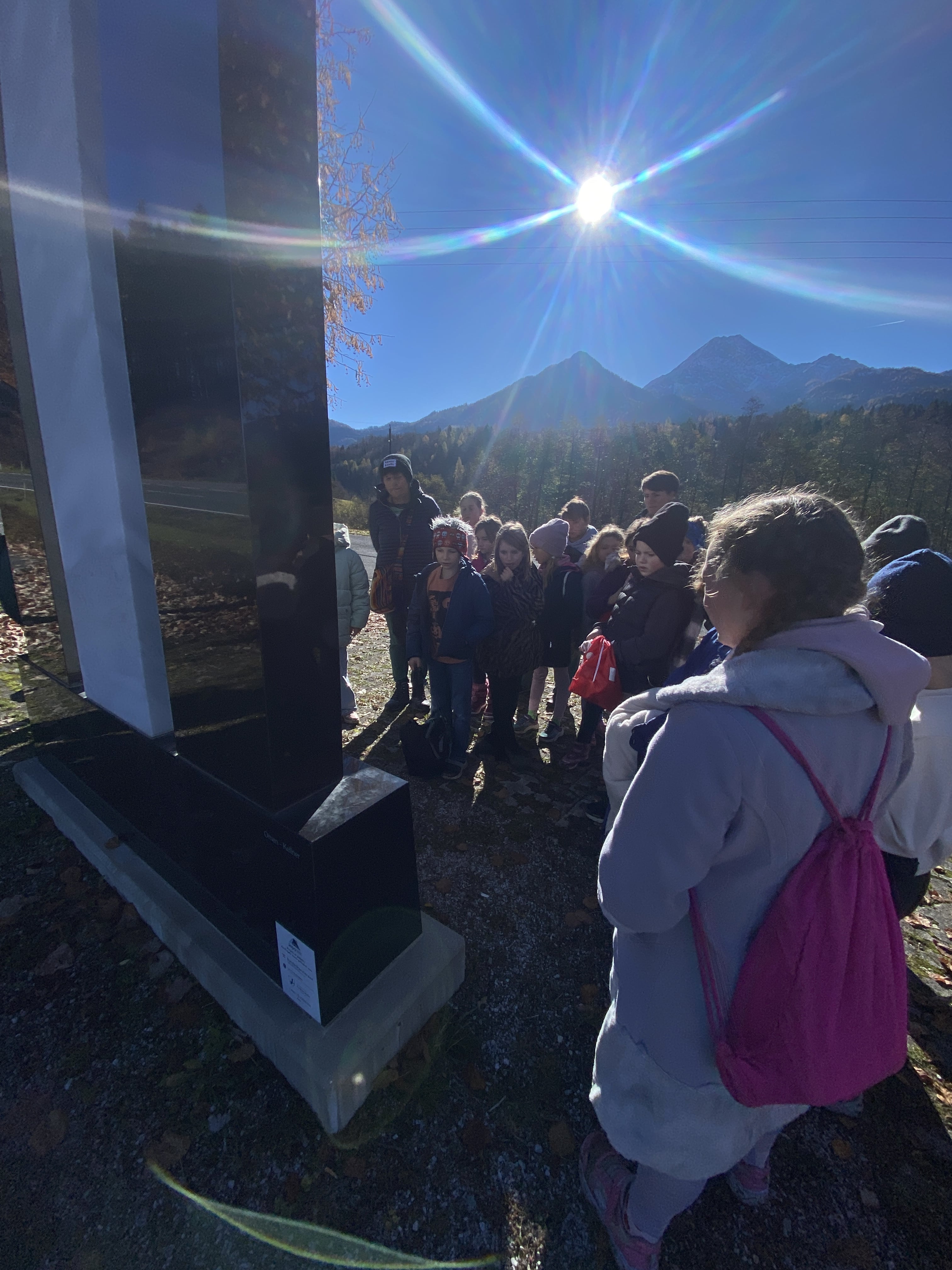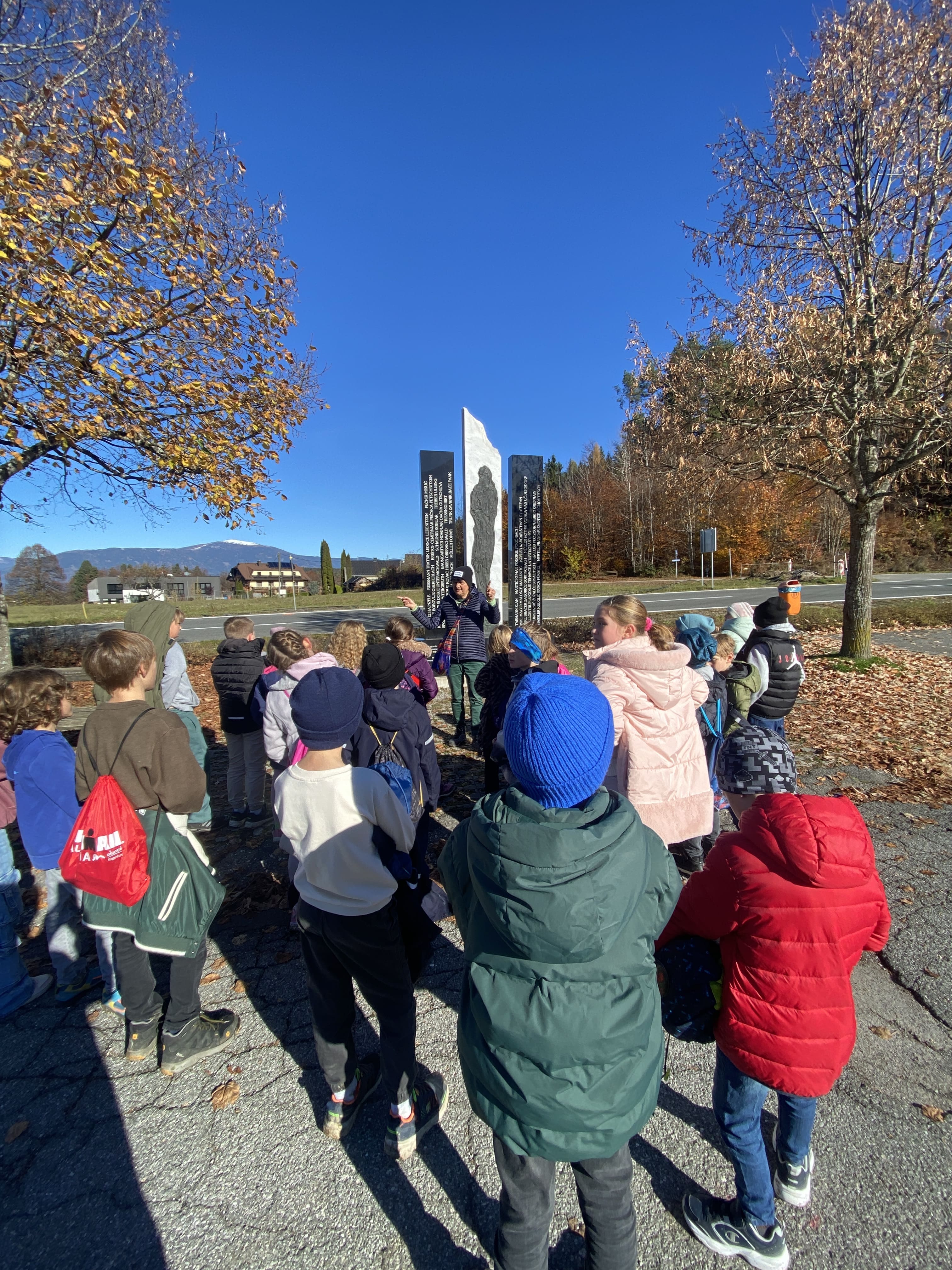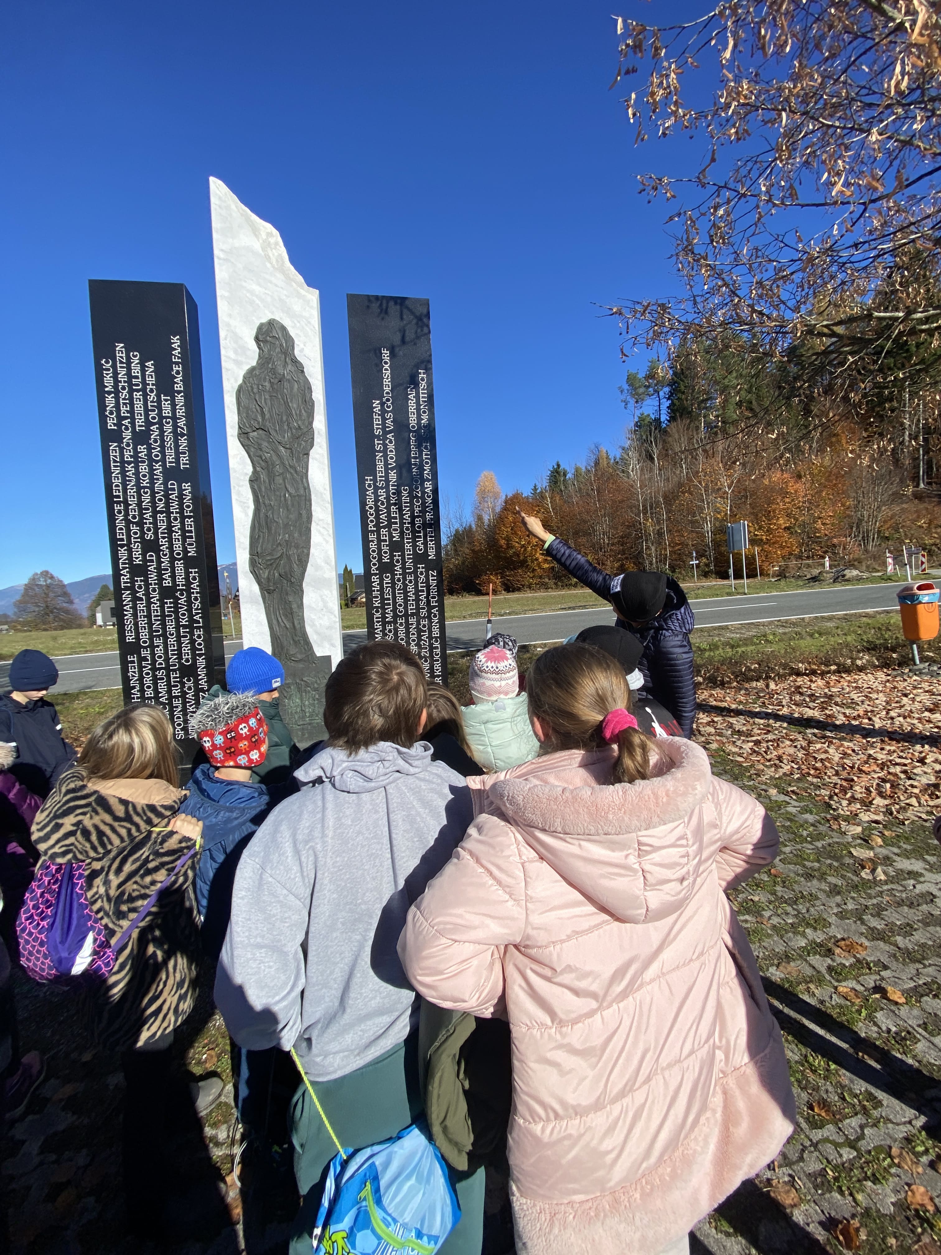 Die beiden 3. Klassen der Volksschule Ledenitzen besuchten am Dienstag, dem 4. November, gemeinsam mit ihren Lehrerinnen und der Schulleiterin das Mahn- und Gedenkmal für die ausgesiedelten Kärntner Sloweninnen und Slowenen aus der Marktgemeinde Finkenstein am Faaker See.