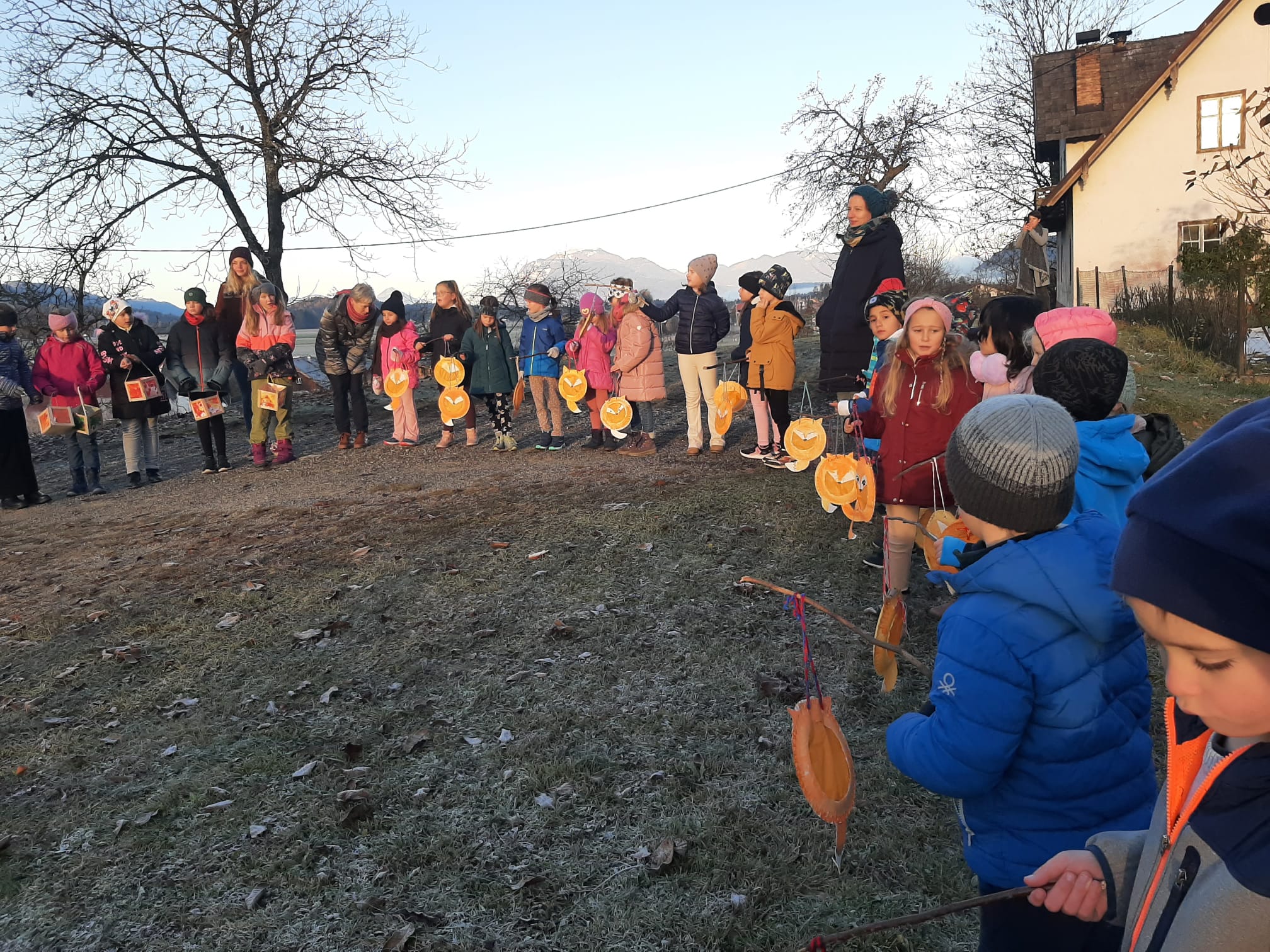 V torek, 11. 11.2025, so vsi otroci naše šole s svojimi lastnoročno izdelanimi lučkami skupaj odšli do cerkve v spodnjih Borovljah, kjer je 2.a razred uprizoril zgodbo o svetem Martinu. Poleg tega smo skupaj zapeli pesmi o lučkah in tako začeli dopoldanski pouk na poseben način.