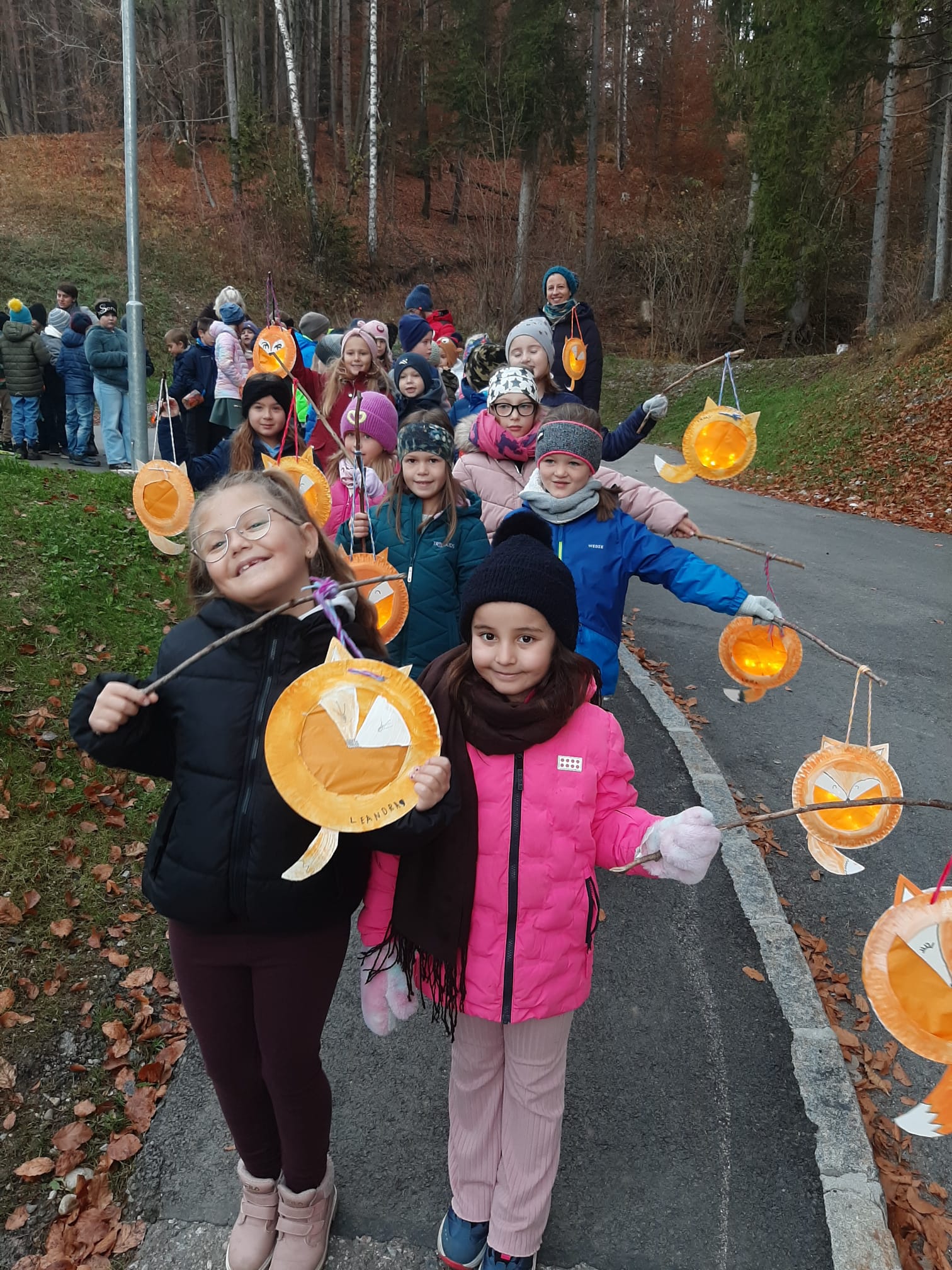 V torek, 11. 11.2025, so vsi otroci naše šole s svojimi lastnoročno izdelanimi lučkami skupaj odšli do cerkve v spodnjih Borovljah, kjer je 2.a razred uprizoril zgodbo o svetem Martinu. Poleg tega smo skupaj zapeli pesmi o lučkah in tako začeli dopoldanski pouk na poseben način.