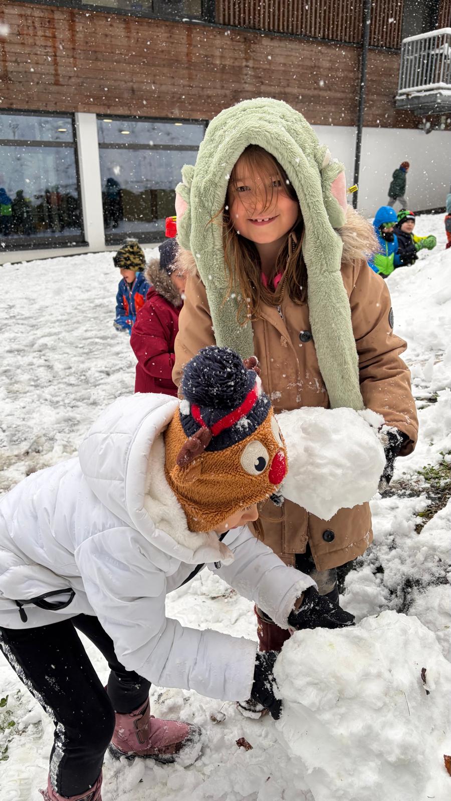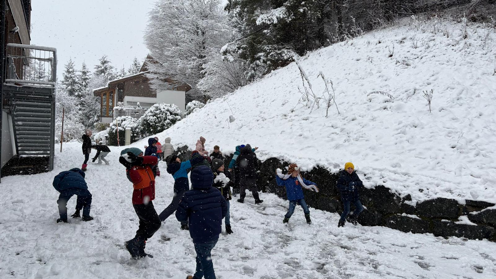 Heute fiel der erste Schnee, und die Freude der Kinder war riesig. In der großen Pause stürmten sie lachend in den Schulhof, um die frischen Schneeflocken zu begrüßen. Einige bauten sofort kleine Schneehügel, andere formten die ersten Schneebälle. Der erste Schnee brachte nicht nur weiße Landschaften, sondern auch viel Begeisterung und Bewegung in den Pausenhof.